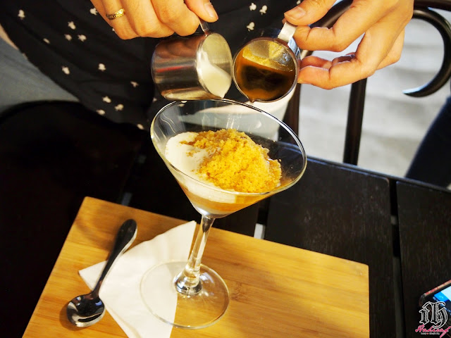 "Sago with hazelnut brittle, ristretto and hot cream. The hazelnut brittle melt as
